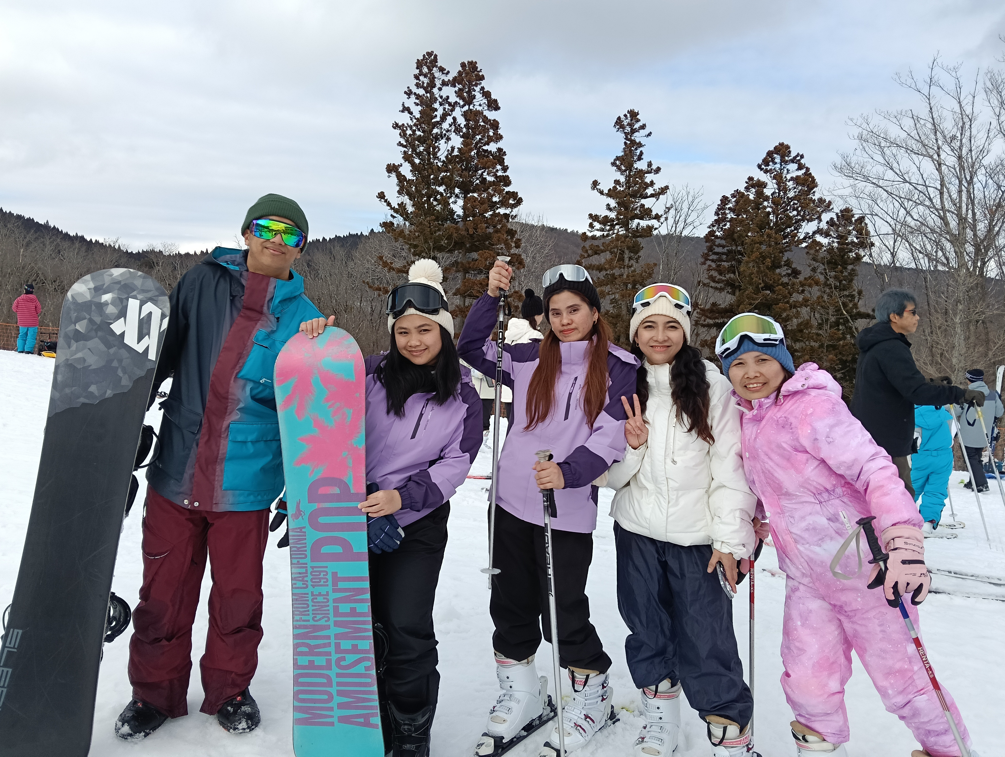 集合写真を撮ってから、スキーやスノーボードをレンタルし、皆ゲレンデへ!